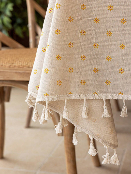 1Pc Autumn Daisy Floral Tablecloth with Tassels, Country Style Yellow Floral Table Cover, Dust Cover for Coffee Table, Bedside Cabinet, Suitable for Dining Room, Kitchen, Picnic, Dinner, Party, Holiday, Room Decor